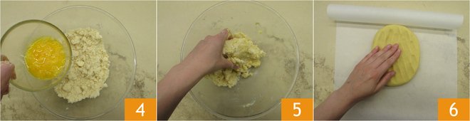 Add the egg 4 and knead for a short time 5 to compact everything. Form a dough ball and place it between two sheets of parchment paper, pressing it lightly 6.