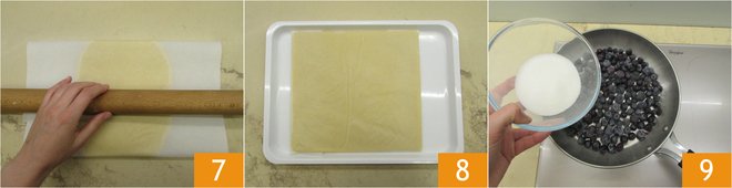 Roll it out slightly with a rolling pin 7, giving it a square shape 8: let it rest in the refrigerator for 30 minutes. Meanwhile, prepare the blueberry compote: pour the blueberries into a slightly warmed pan and add the sugar 9. Let it cook over medium-high heat for about 10 minutes, stirring occasionally.