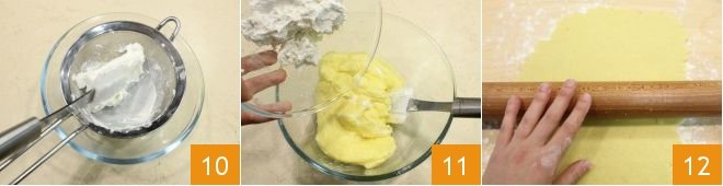 Sift the ricotta 10, which you have taken care to drain at least 2 hours before from the excess whey (better still if overnight). When the cream is well chilled, take it and add the ricotta 11; mix and also pour in the lemon juice. Cover the cream with plastic wrap and take the shortcrust pastry: roll it out into a sheet about 0.2 inches thick 12.
