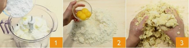 To make the ricotta and lemon cream pasticciotti, start with the shortcrust pastry: in a mixer, place the sifted flour, a pinch of salt, the butter just taken out of the fridge, the seeds of a vanilla pod, and the powdered sugar 1. Blend to obtain a sandy mixture, then pour it onto a work surface, create the classic fountain shape and add the egg yolks 2. Knead everything quickly 3, just long enough to create a compact and homogeneous dough.