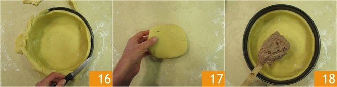 Apply light pressure with your hands to ensure the dough adheres well to the pan. Use a small knife to remove excess dough from the edges 16. Quickly work all the dough scraps 17, which will be used to make the lattice. Retrieve the ricotta and Nutella cream from the fridge and use it to fill the pastry shell 18.