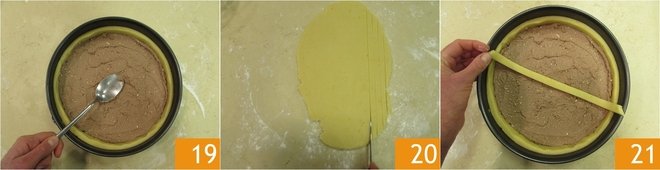 Level the surface well with a spoon 19. Then roll out the remaining dough to a thickness of 1/4 inch and cut strips about 3/4 inch wide 20. Arrange the strips on the tart, first in one direction 21