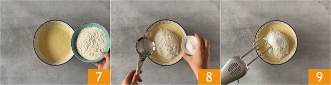 You can add the flour 7 and the sifted baking powder 8, incorporating them always with the beaters 9.