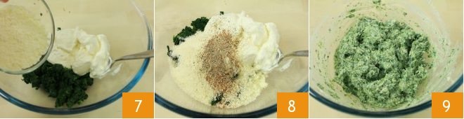 Place the chopped spinach in a bowl where you will add the ricotta and grated Grana Padano PDO 7, nutmeg, salt, and pepper 8. Mix all the ingredients until you get a soft but compact mixture 9.