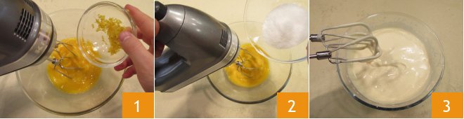 To prepare the ricotta and strawberry cake, start with the genoise sponge. Pour the room-temperature eggs into a bowl, add the honey, the grated lemon zest 1, then the sugar a little at a time. Turn on the beaters and whip for about ten minutes until the mixture is fluffy and light and forms ribbons when lifting the beaters 3.
