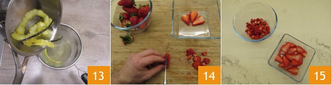 and when it is dissolved, strain and let it cool 13. In the meantime, move on to the strawberries. After briefly immersing them in fresh water, drain and clean them. Remove the top part and slice enough to line the circumference of the pan 14. The rest should be chopped and gathered in a bowl 15.