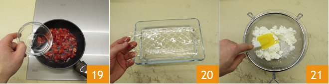 along with the sambuca, and sauté over high heat: be careful of any flames if you have a classic stove. As soon as they are slightly softened, turn off the stove and set aside 19. Now let's move on to the cream. Soak the gelatin in cold water for about ten minutes 20. Meanwhile, sift the ricotta 21