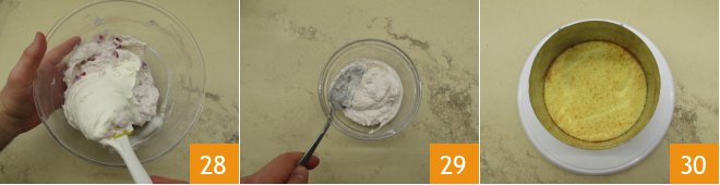 gently fold it in 28. Set aside a couple of tablespoons, preferably without strawberries 29. At this point, everything is ready, proceed with the assembly. In a pastry ring lined with acetate (the circumference will probably be slightly smaller than the initial 8 inches) placed on a turntable or classic plate, place the first genoise sponge disk 30.