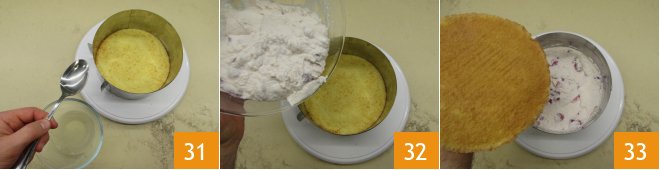 Moisten with a bit of syrup 31, pour the cream with the strawberry pieces 32, and then place the other disk 33.