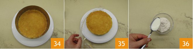 Moisten the surface and refrigerate for a couple of hours 34. After the time has passed, remove the acetate 35 and proceed to glaze the cake. Take the reserved cream and thin it with a bit of cream until you have a soft, not too liquid cream 36.