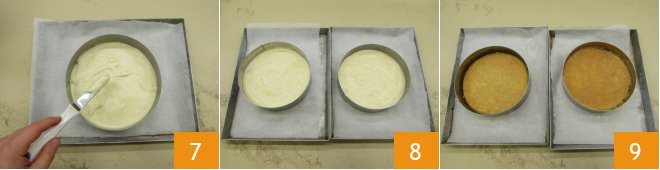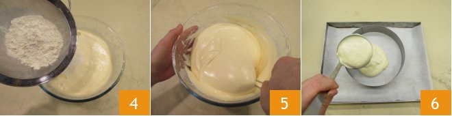 Turn off the beaters, place a sieve and sift the flour 4. Gently incorporate it with upward movements using a whisk or spatula 5. Transfer the mixture into two greased and floured 8-inch cake rings or pans 6.