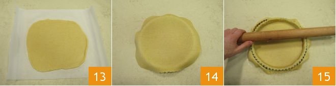 Lastly, add the ricotta 10 and blend until smooth 11; set aside. Take the shortcrust dough and remove the wrap, beat it with a rolling pin to soften it a little bit, then divide it into two parts, one double the size of the other, and start rolling the larger one between two sheets of baking paper 12.