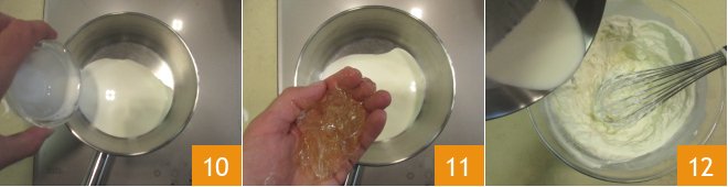 Then heat the remaining 2 tbsps (30 g) of heavy cream in a saucepan 10, when it is about to boil, drain the gelatin and pour it into the cream 11. Stir off the heat until the gelatin is completely dissolved, then add to the cream 12.