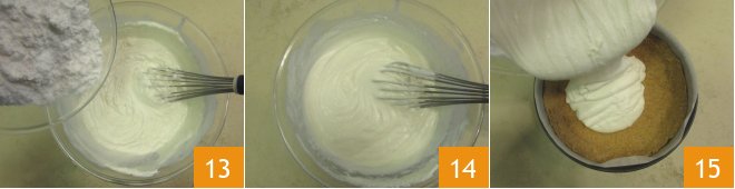 Sweeten the preparation by adding the powdered sugar 13 and continue to mix gently until it is completely absorbed 14. Retrieve the pan and pour the cream into it 15,