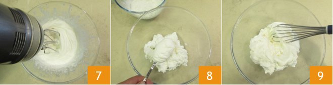 Now let's move on to the cream. In a bowl, pour 3/4 cup (200 g) of heavy cream and whip it until it is soft and frothy 7. Spoon it into a bowl with the ricotta 8 and fold gently 9.