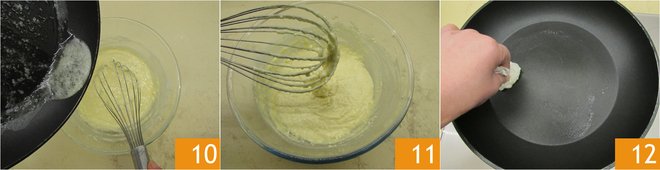 Gently fold in the now-cooled butter 10, working the batter as little as possible: you will get a fairly thick consistency 11, similar to cake batter. Don't worry if there are lumps, it's normal. Wipe the pan with a piece of kitchen paper to remove excess melted butter 12.