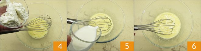 until the mixture becomes slightly frothy; you don't need to whip it. Add the ricotta 4 and mix gently to combine it. Then pour in the milk 5 and stir briefly again 6.