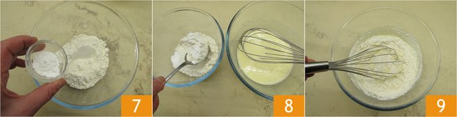 Sift the flour and baking powder separately, add a pinch of salt 7. Then gradually add the dry ingredients to the egg mixture 8, stirring just enough to incorporate them 9.