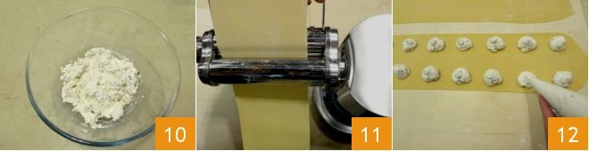 The mixture is now ready 10: transfer it to a piping bag fitted with a large nozzle and set aside in the refrigerator. At this point, the fresh pasta will have rested: take it and divide it into two equal-sized pieces. Keep one covered with plastic wrap until it's time to roll it out, while you can dust the other slightly with semolina flour so that it doesn't get absorbed; pass the dough through the rollers of the pasta machine: roll it through the rollers from the widest setting to the second-to-last to obtain a sheet about 2-3 mm thick 11, which you will place on a lightly dusted surface with semolina flour. Take the piece you've wrapped in plastic: remove the wrap and repeat the operation, rolling it out next to the other sheet, taking care to dust the surface with a little semolina flour. Use the piping bag to create small mounds of filling, spacing them about 1 inch apart on one of the two rolled-out rectangles 12.
