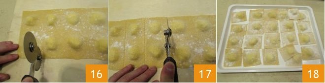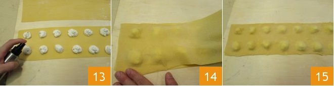 Sprinkle water on the edges of the dough 13 or, if you prefer, brush the edges of the ravioli with a kitchen brush. This will help ensure that the two sheets stick together when you cover with the other pasta sheet; align the edges 14 and apply slight pressure with your fingertips between the mounds of filling to remove air 15 and prevent them from opening during cooking and the filling from spilling out.