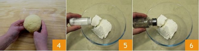 When the dough is smooth and elastic, transfer it to the work surface, shaping it into a sphere 4 and wrap it in transparent plastic wrap. Let the dough rest for 30 minutes at room temperature, keeping it away from light and drafts to avoid drying out. While the dough rests, focus on the filling. Take a bowl in which you will pour the ricotta, seasoning with salt 5 and pepper 6.