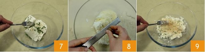 Add the thyme leaves, washed and dried, mixing them with the ricotta 7. Then add the Grana Padano and flavor with nutmeg 8, mixing the ingredients well with a fork 9.
