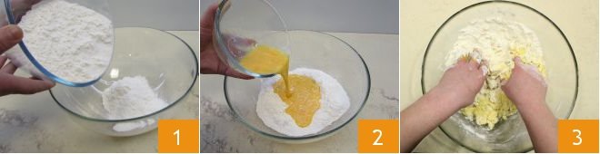 To prepare the ricotta ravioli, start by making the Homemade pasta (sheets and shapes). In a large bowl, pour the flour (holding back about 40-50 g from the recommended amount) 1 and the beaten eggs 2. Knead the ingredients vigorously by hand until you obtain a homogeneous mixture 3. Add the reserved flour as needed to achieve the right dough consistency: smooth and elastic. If the dough is too hard, you can add a little room-temperature water: this will make the pasta softer and easier to roll with the machine.