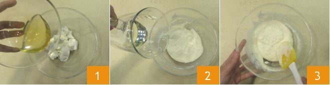 To make the ricotta ring cake with honey and pine nuts, first soften the ricotta with honey in a bowl 1 making it creamy, add the vegetable oil 2 and mix the mixture with a spatula 3.