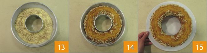 Distribute the pine nuts on top 13 and bake the cake in a preheated static oven at 356°F for about 35 minutes. Once cooked, remove the ricotta ring cake with honey and pine nuts from the oven 14, let it cool slightly before unmolding and serving it 15.