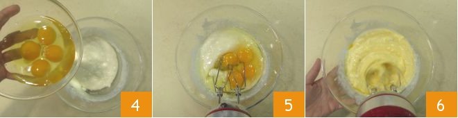 Add the whole eggs to the ricotta mixture 4 and mix with electric beaters for about 5 minutes 5, the eggs should be completely absorbed 6.