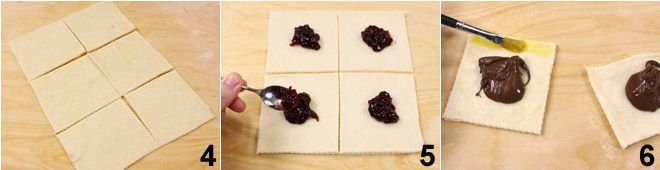 Remove the dough from the refrigerator and with the help of a rolling pin, roll out the dough into a rectangle shape and a thickness of about 1/16 inch. With a fluted pastry cutter, cut the dough into squares with 4-inch sides 4, and place a teaspoon of Nutella or cherry jam in the center of each 5. Beat an egg in a small bowl, and with a brush, coat the edges of the pastry squares,