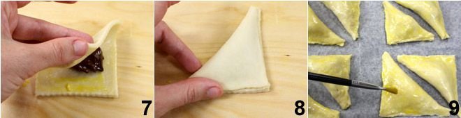 before folding them diagonally 7 to form triangles 8. Once closed, place the triangles on baking sheets lined with parchment paper and brush their surface with the beaten egg 9, then bake them for 20-25 minutes at 356-392°F. Once baked, remove the triangles from the oven and place them on a tray, optionally sprinkle with powdered sugar, and serve them warm (to avoid burning yourself with the fillings) or cold.