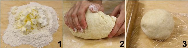 To prepare the ricotta triangles with cherry jam and Nutella, start with the dough preparation: place the flour, the cold butter cut into pieces, and the ricotta on a pastry board 1, and knead the ingredients well until you obtain a smooth and elastic dough 2. If during this operation the mixture sticks to the pastry board, sprinkle it several times with flour, until the dough is elastic and dry. At this point, wrap the dough in plastic wrap and place it in the refrigerator for at least half an hour 3.