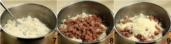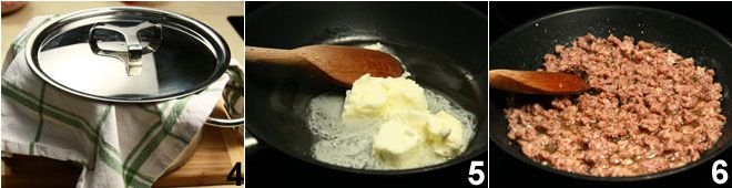 Meanwhile, melt the butter in a pan 5, add the sausage 6 that you have skinned and crumbled with a fork, and brown it over moderate heat, breaking it up with a wooden spoon and melting it as much as possible.
