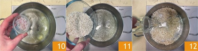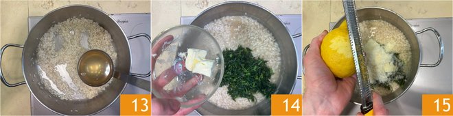Moisten with the hot broth, one ladle at a time 13, waiting for the liquid to be absorbed before adding more. When the rice is cooked, after about 18-20 minutes, add the agretti, reserving a couple of tablespoons to garnish the plates, then stir in butter 14 and grated Parmesan. Scent with grated lemon zest 15.