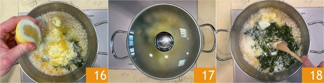 Season the risotto with a few drops of lemon juice 16, then, without stirring, cover with a lid and let it rest for a minute 17. Then stir 18 to combine all the flavors.