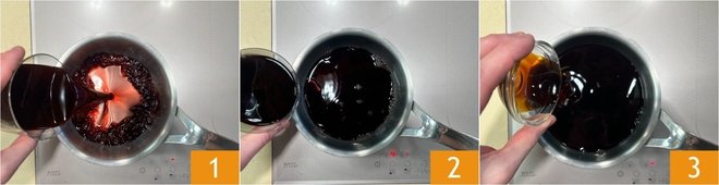 To prepare the risotto with radicchio and taleggio, start with the wine reduction: in a small saucepan pour the red wine 1, the Port 2, and balsamic vinegar 3. Reduce the sauce over high heat.