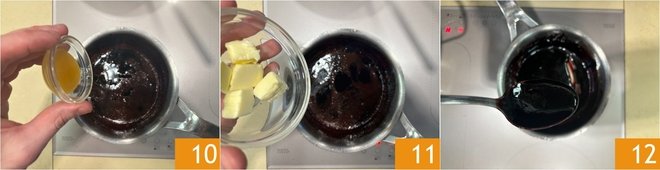 Meanwhile, the sauce will have thickened (it should coat the spoon like syrup), add the honey 10 and stir. With the heat off, add the very cold butter 11, emulsify 12, and set aside.