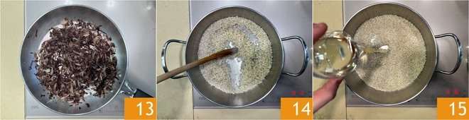In the meantime, the radicchio will be cooked, so turn off the heat and set aside 13. In a pan, toast the rice over medium heat with a pinch of salt, stirring continuously 14. When the rice is hot, deglaze with white wine 15 and let the alcohol evaporate.