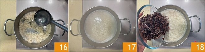 Now cook the rice by adding hot unsalted water little by little 16. Make sure the rice is always covered by about a quarter-inch of water 17. Halfway through cooking, add the radicchio 18.