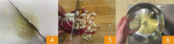 Meanwhile, peel and chop the onion 4. Finely slice the radicchio as well 4 and discard the tough central part. In a pan, pour a drizzle of oil and add the onion 6.
