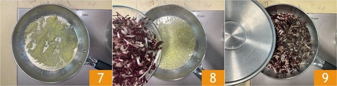 Salt and stew until the onion is wilted 7. At this point, add the radicchio 8, lower the heat, cover with a lid, and cook for 5-8 minutes 9.