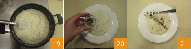 Stir in the butter 16, the Pecorino 17, and almost all the pepper 18, saving some for the final decoration.