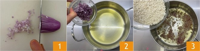 To make the King's Risotto, first, place the saffron threads in a small bowl, cover with cold water, and let them soak for 2 hours. In the meantime, prepare the chicken broth and keep it warm. Finely chop the red onion 1 and sauté it in a large saucepan with a generous splash of olive oil 2, then add the rice 3.