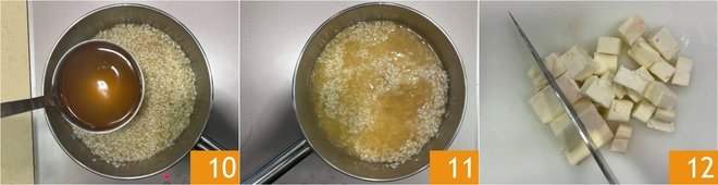 Let the alcohol evaporate completely, then add a ladle of hot broth 10 and wait for it to be absorbed. Cook the rice by adding a ladle of broth at a time 11. Meanwhile, cut the Taleggio into cubes 12.
