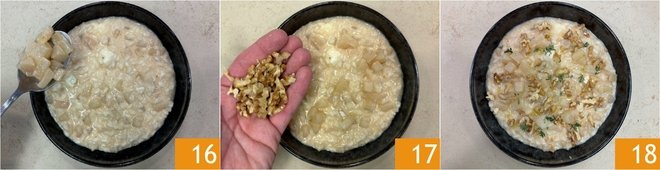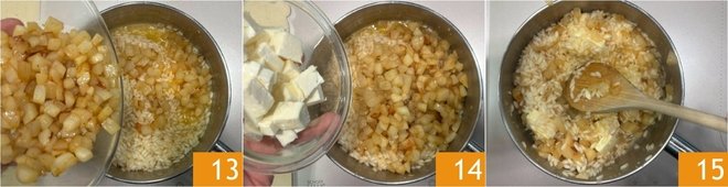 When there are 2 minutes left to finish cooking the risotto, add the caramelized pears, keeping some aside for decoration 13, and the Taleggio 14. Turn off the heat and stir well to combine 15.