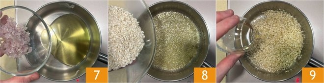 Sauté the chopped shallot in a saucepan with a dash of oil 7, then add the rice 8, salt it, and toast it, stirring often. When the grains are hot to the touch of your hand, deglaze with white wine 9.