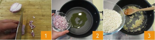 To make the beer, saffron, and Grana Padano risotto, first prepare the Vegetable broth and keep it warm. Then clean the shallot and finely chop it with a knife 1. Heat the olive oil in a pan, add the shallot 2 and let it soften over moderate heat until it becomes tender. Pour in the rice 3 and toast it for a couple of minutes.