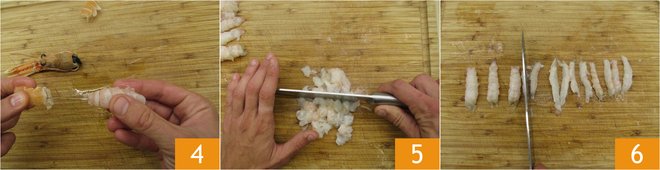 Prepare the parsley mince that you will use to season the langoustine tartare. Now clean the langoustines, remove the shell 4, eliminate the gut, and chop half of the langoustines into tartare 5 and the rest in half lengthwise 6.