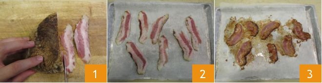 To prepare the risotto with colorful cauliflowers, stracciatella, and guanciale, start by removing the rind from the guanciale, then slice it thinly 1 and place the slices on a baking sheet with parchment paper 2, then bake in a preheated oven at 356°F in fan mode, for about 8 minutes 3.